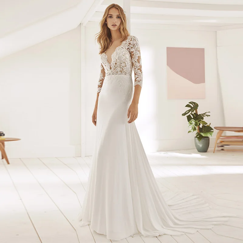 Lace Chiffon Backless Boho Wedding Gowns With Sleeves Loveangeldress