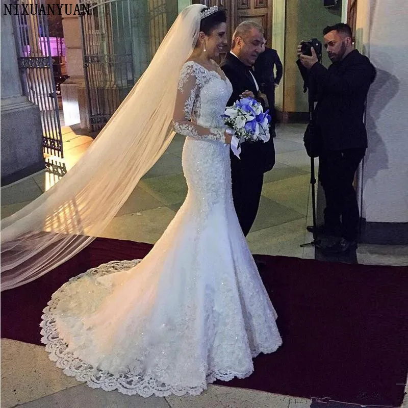 Vintage Wedding Dress Long Sleeve Sheer Back Lace Mermaid Bridal