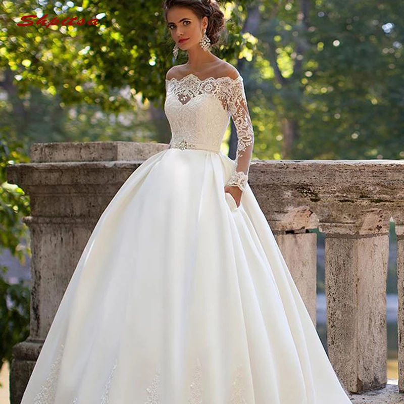 Long Sleeve Lace Wedding Dresses Ball Gown Satin Off Shoulder Plus