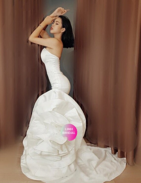 Dramatic One Side Flare Skirt White Satin Off The Shoulder Etsy