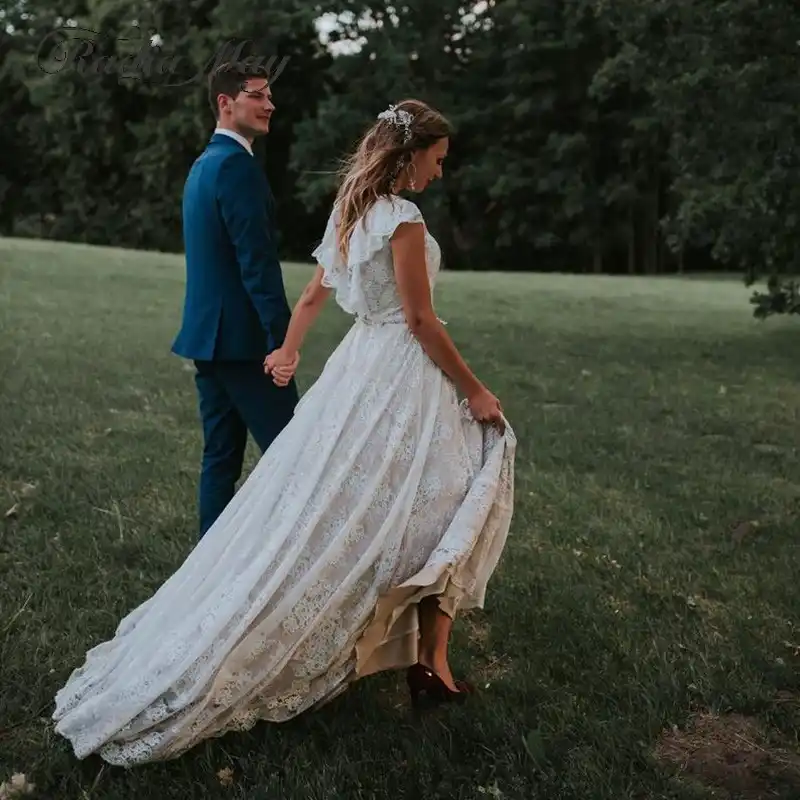 Lace Boho Country Style Wedding Dress Ruffled Backless Beach