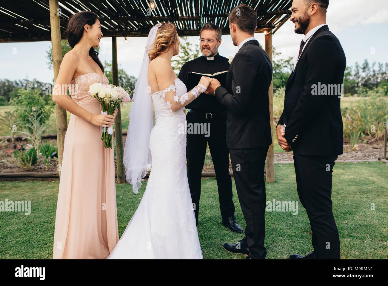 Bride And Groom Standing In Front Of Priest Witness By Bridesmaids