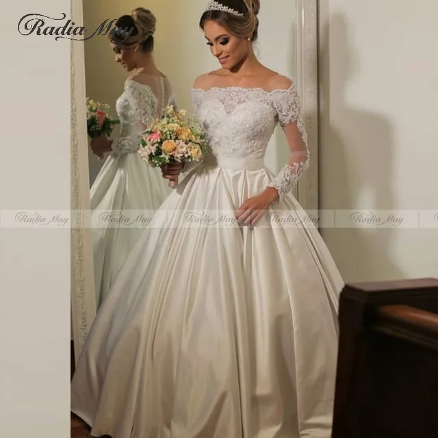 Elegant Off Shoulder Satin Wedding Dress Long Sleeves Lace Ball