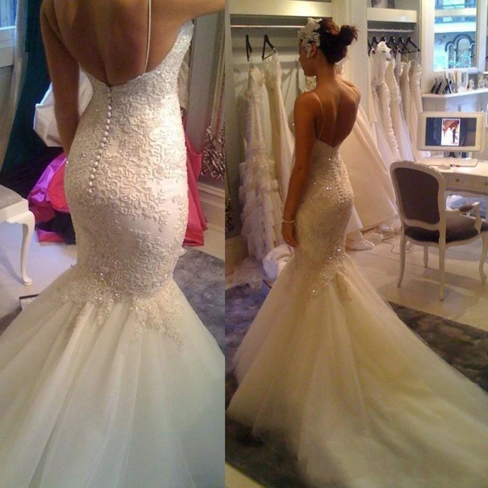 White High Quality Lace Open Back Spaghetti Straps Mermaid Wedding