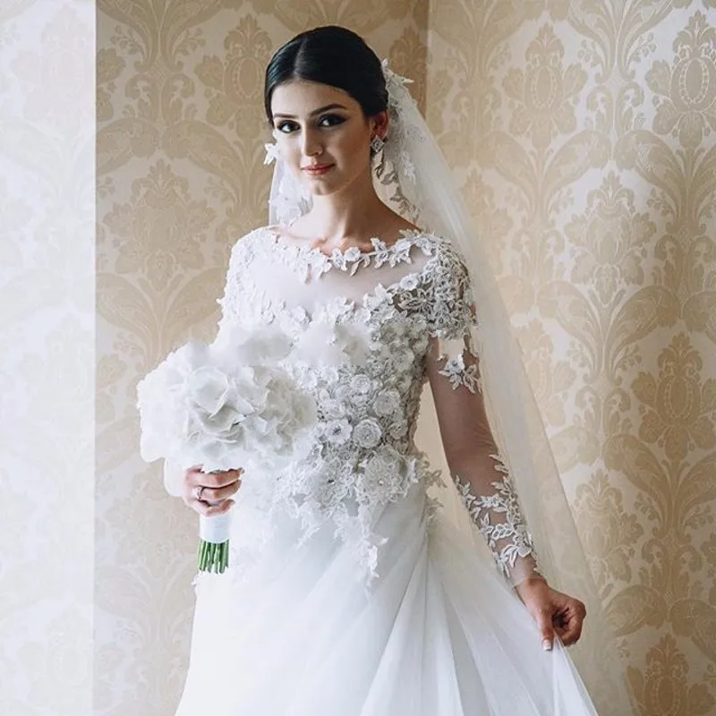 Luxury Long Sleeve 3d Flower Crystals Beaded Wedding Dress With