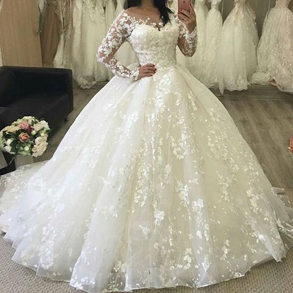 Sheer Long Sleeve Wedding Gown See Through Jewel Neck Floral Lace