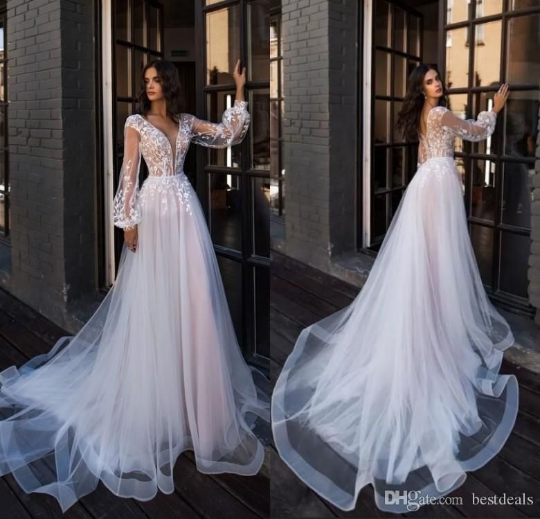 Discount 2019 Romantic Bohemian Wedding Dresses Deep V Neck Sheer