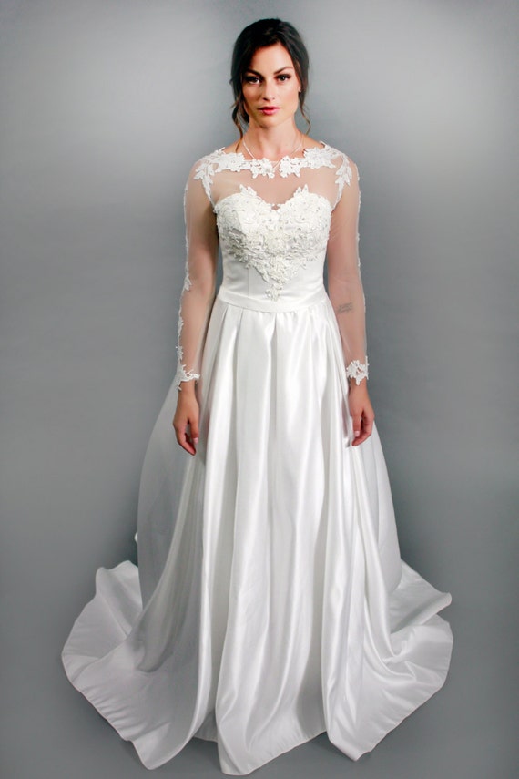 Classic Long Sleeves Satin Lace Applique Wedding Dress Etsy