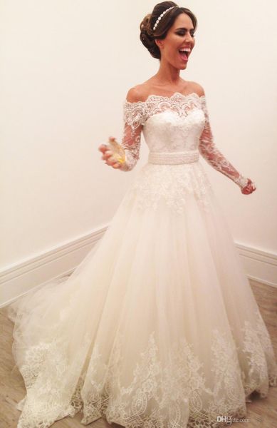 Long Sleeve Wedding Dresses A Line Lace Off Shoulder 2017 New