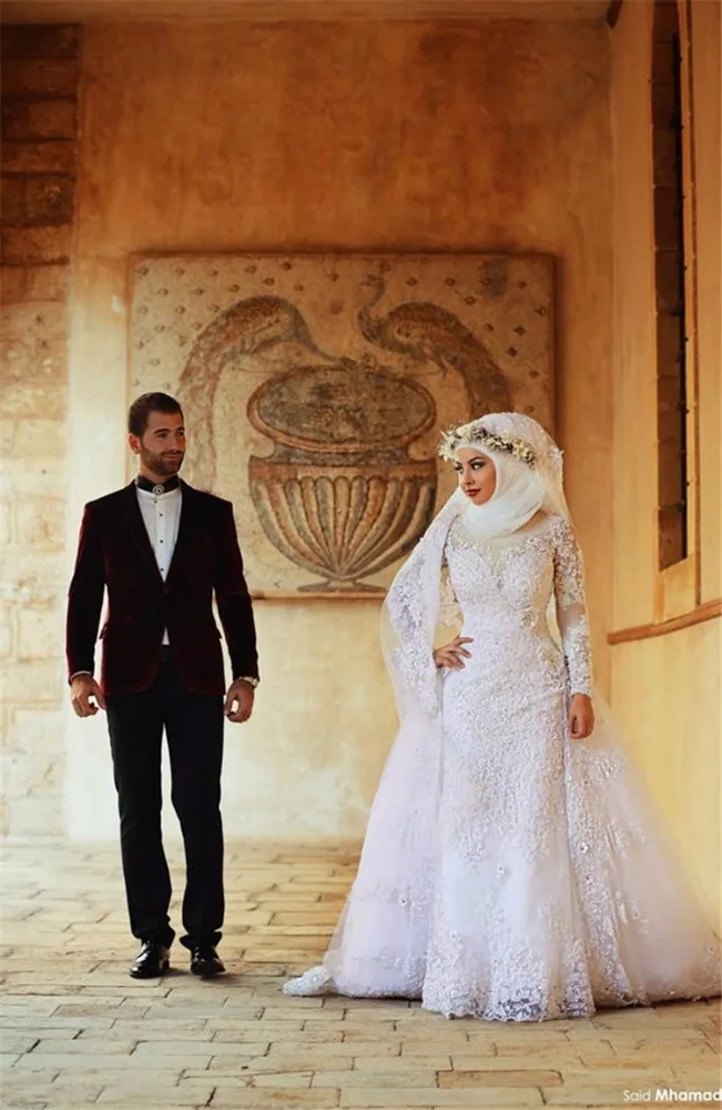 Hot Sale Muslim Wedding Dress Long Sleeve Lace Mermaid Pakistani