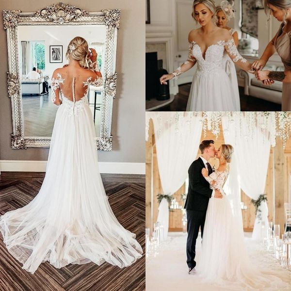 Discount Romantic Sheer Long Sleeves Bohemian Bridal Gowns Chic