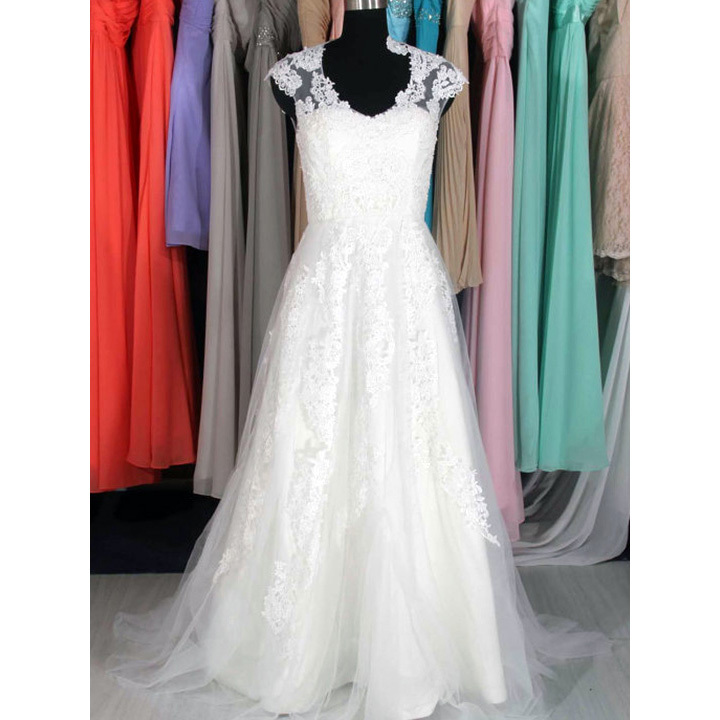 Vintage Cap Sleeves Lace Long Wedding Dress Covered Buttons A