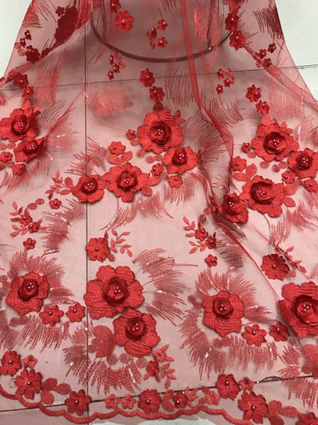 Red 3d Flower Embroidered Tulle Lace Fabric Wedding Dresses