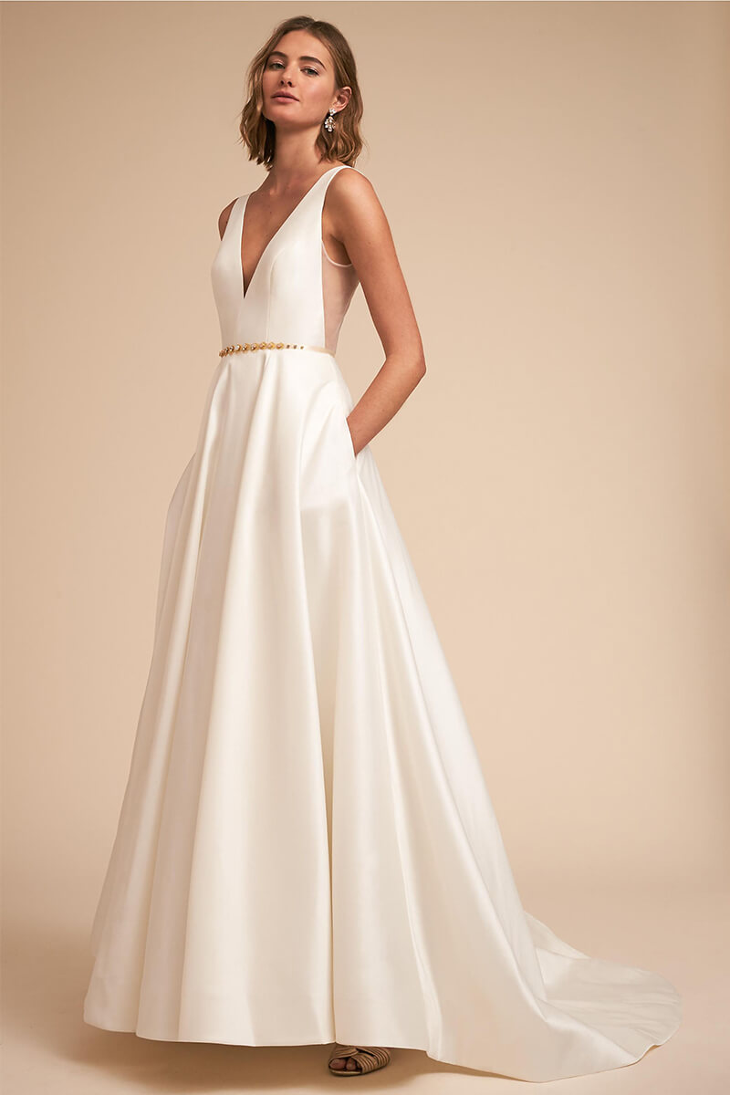 Simple Ivory Satin V Neck Wedding Dress With Bow Knot Tirdresses