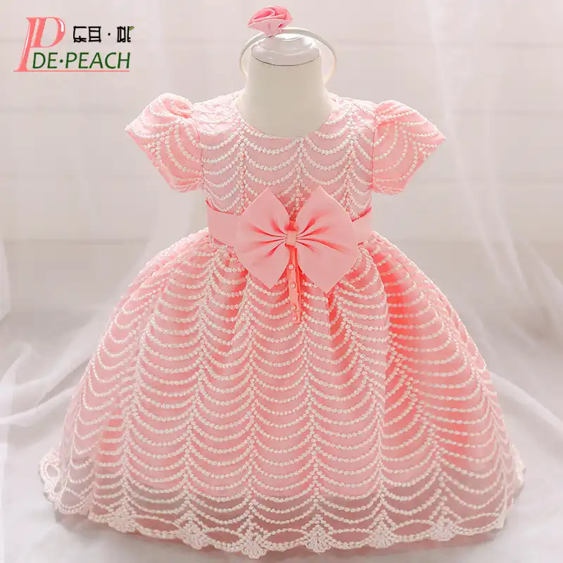 De Peach 2019 New Baby Wavy Striped Beaded Dress Baby Girl