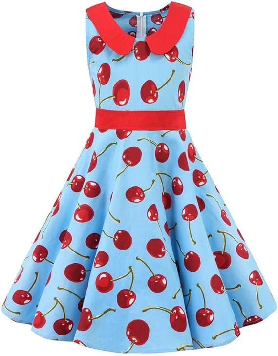 Moonker Child Girls Cherry Print Princess Dress Teen Kids 1950s