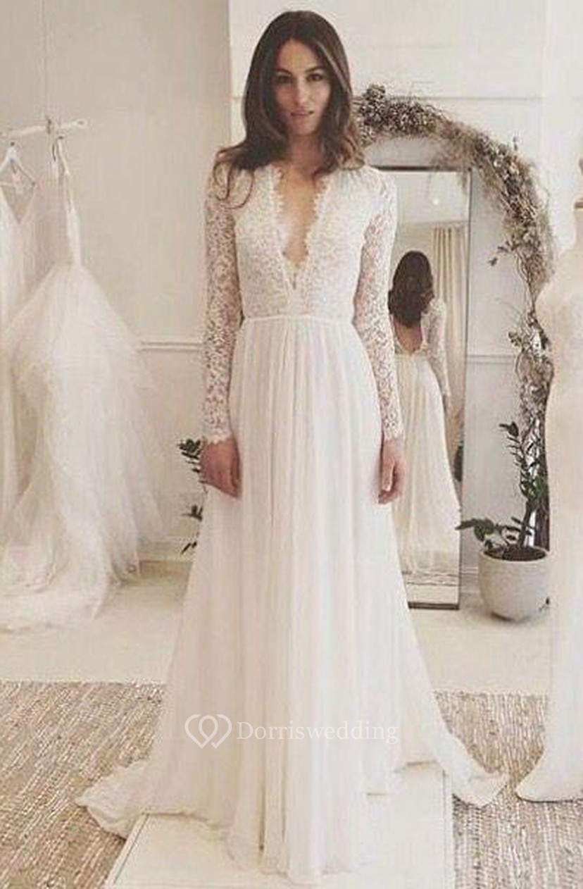 Lace Beach Wedding Dresses Bohemian Long Sleeve Backless Chiffon