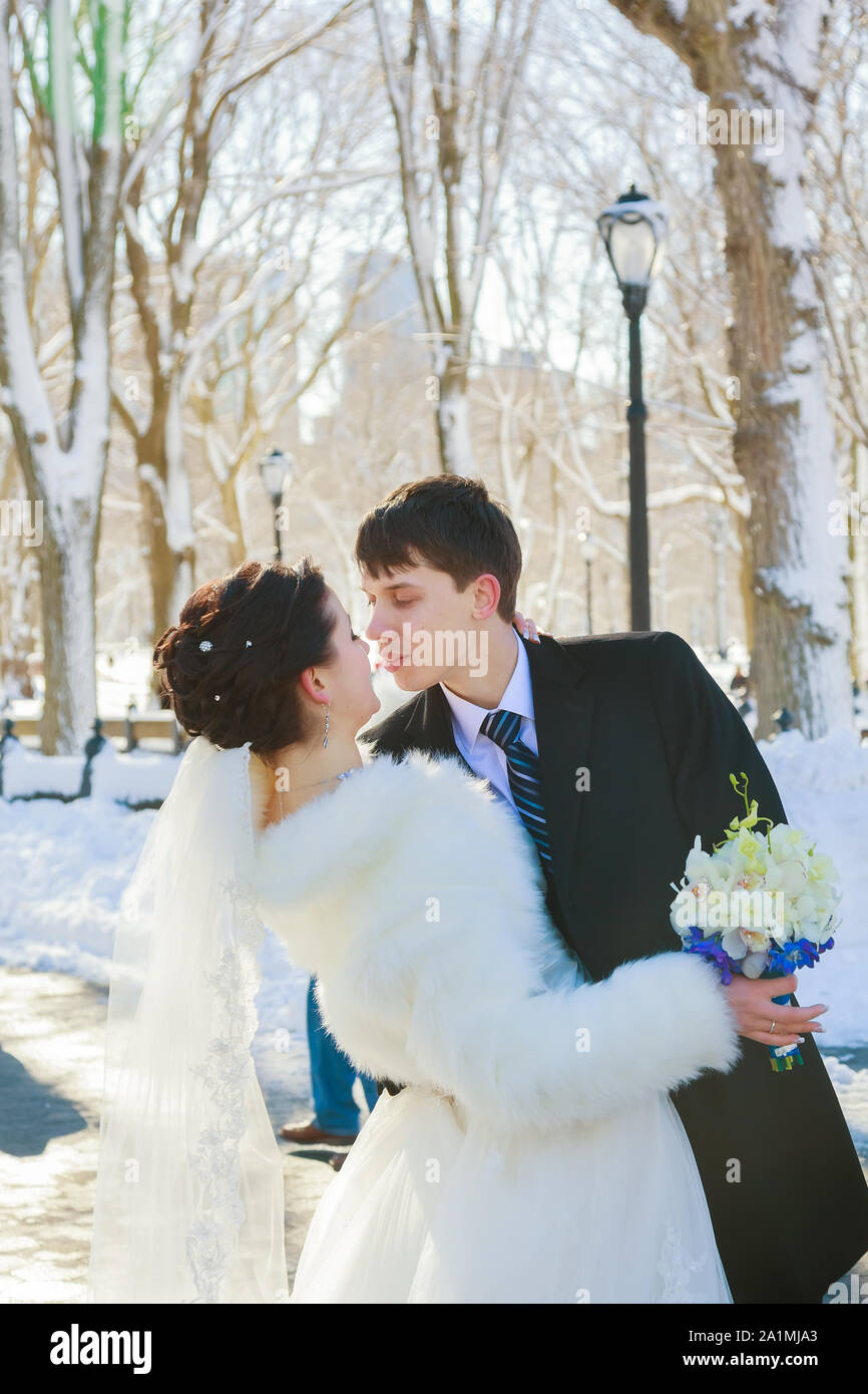 Young Couple Newlyweds Walking In A Winter Forest In The Snow