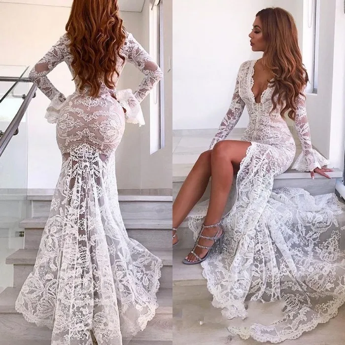 New Fashion Sexy High Slit Wedding Dresses Long Sleeve Vinatge