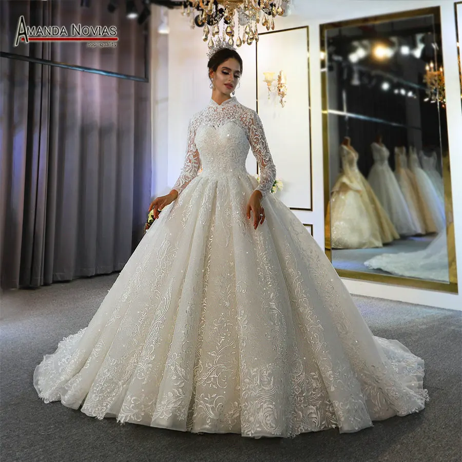 Elegant Full Lace High Neckline Muslim Wedding Dress 2020 Luxury