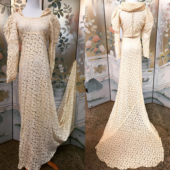 1930s Art Deco Lace Wedding Dress With Long Sleeves And Train Size