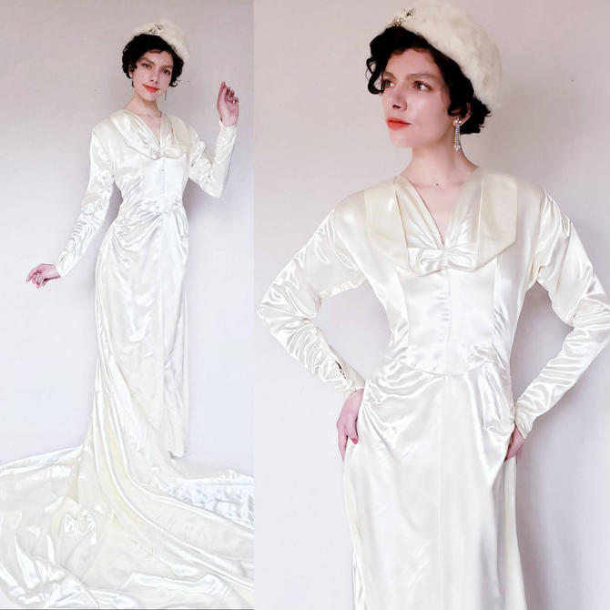 1930s Wedding Dress Ivory Satin Long Sleeves 30s Bridal Gown