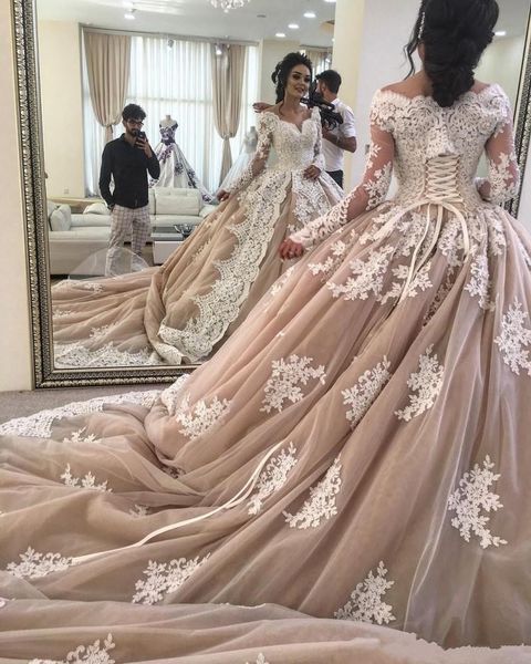 Champagne Wedding Dresses Lace Up Back Indian Winter Long Sleeve