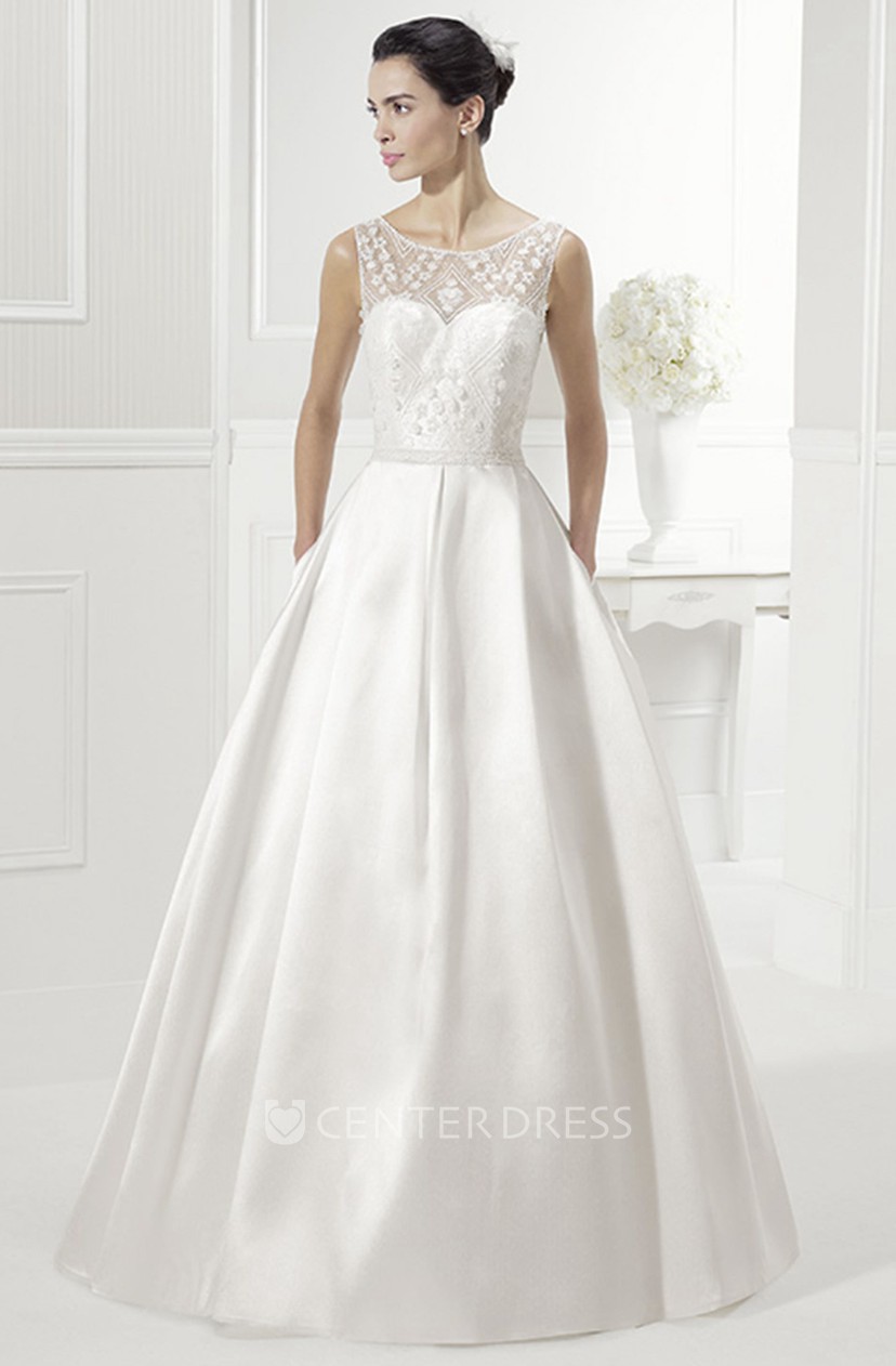 Jewel Neck Sleeveless Taffeta Bridal Ball Gown With Lace Bodice
