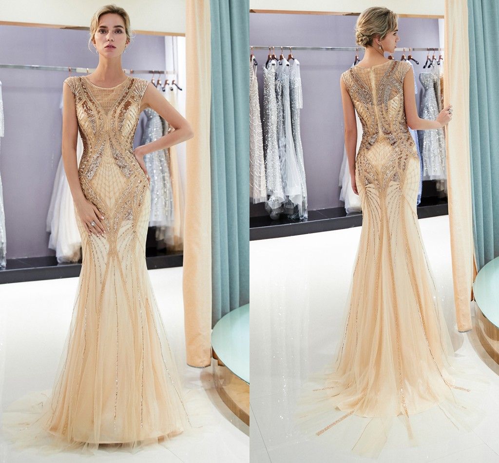 Real Photos 2019 New Elegant Designer Gold Prom Dresses Sequins