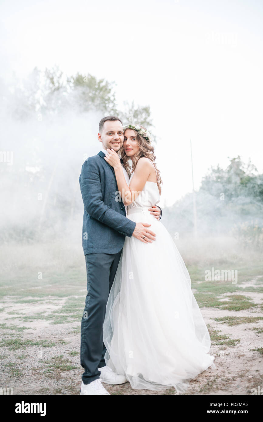 Bride And Groom At Wedding Day Walking Outdoors On Summer Nature