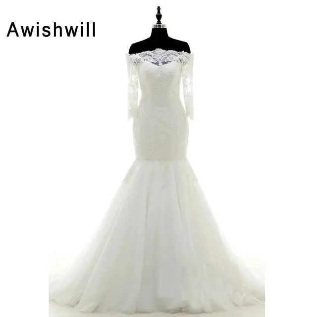 Women S Mermaid Wedding Dresses Off The Shoulder 3 4 Sleeves Lace