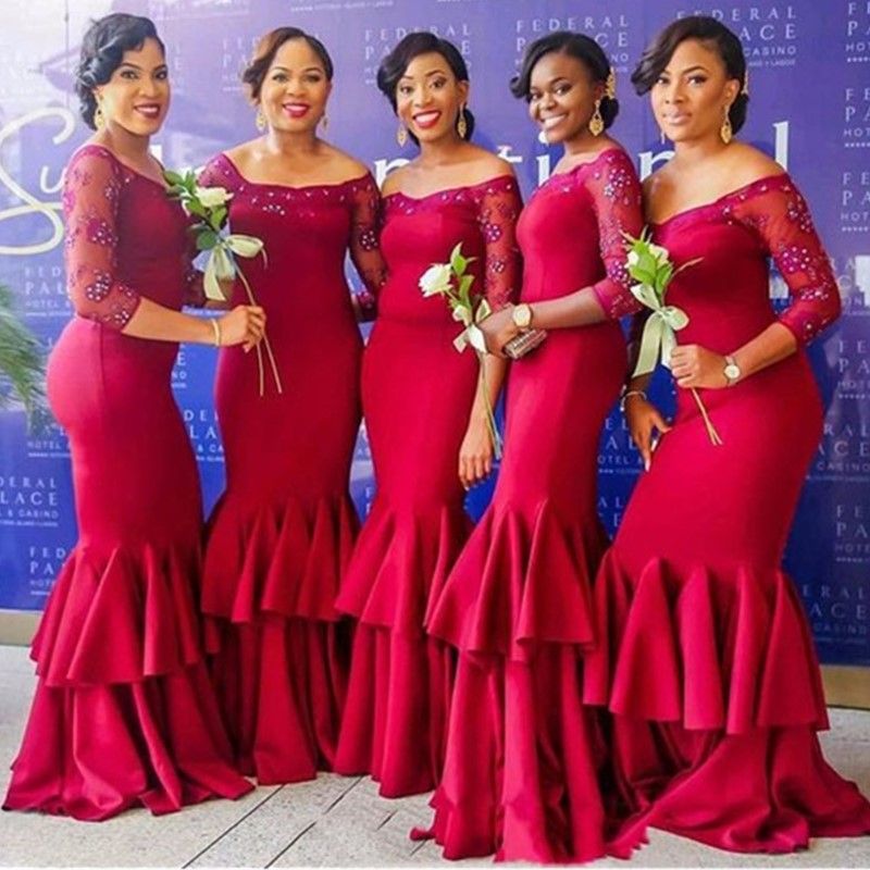 Arabic Style Dark Red Mermaid Off Shoulder Bridesmaid Dresses Long
