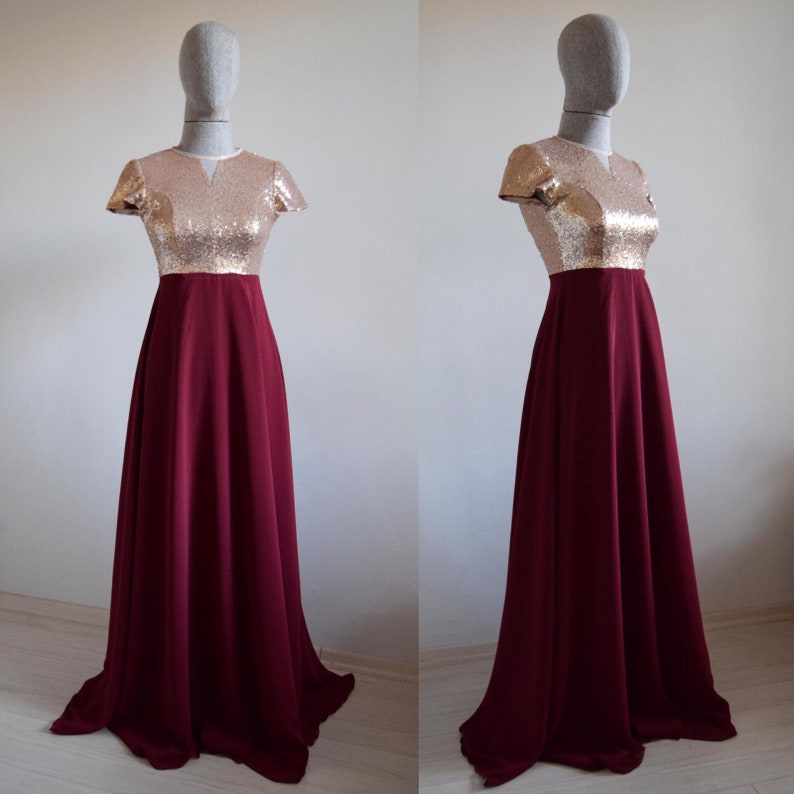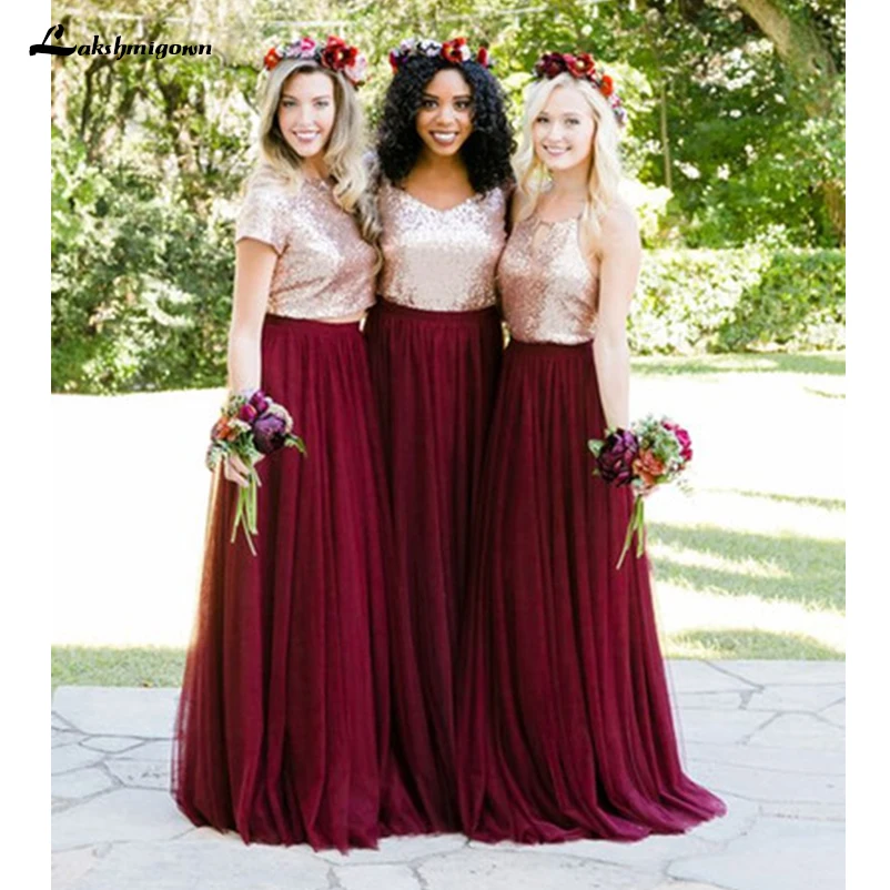 Two Tone Pieces Rose Gold Sequin Burgundy Bridesmaid Dresses 2019