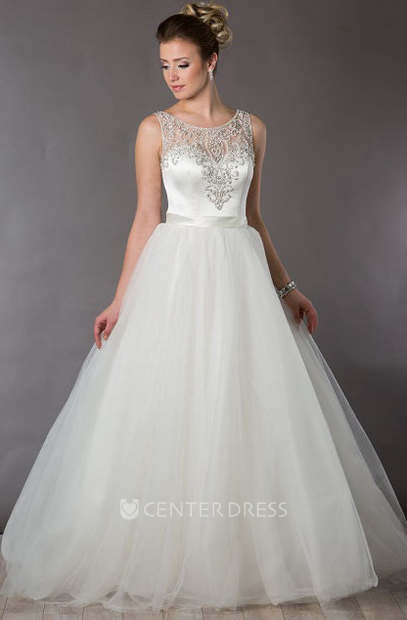 Scoop Neck Satin Top Tulle Skirt Bridal Ball Gown With Crystals