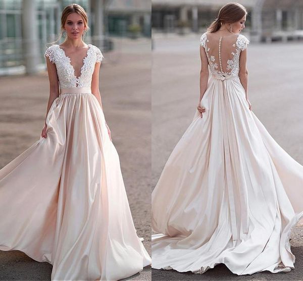 Discount Elegant Light Champagne Wedding Dresses Sheer Neck Cap