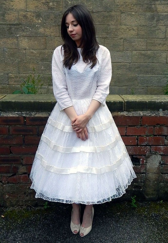 Original Vintage 1950s Tea Length Lace Wedding Dress Uk Size Etsy