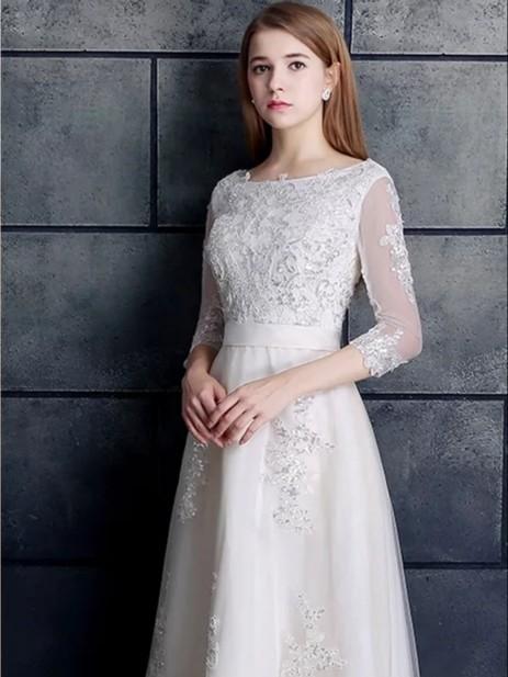 A Divine Wedding Dress With Lace Bodice And Three Quarter Sleeves