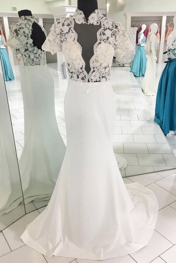 White Wedding Dress Lace Applique Wedding Dress Short Sleeves