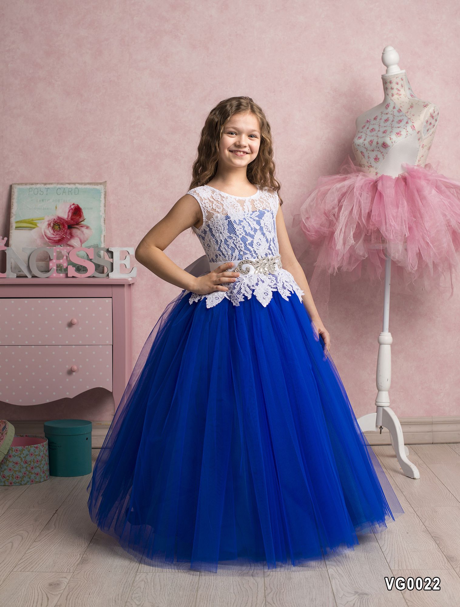 White Royal Blue Flower Girl Dress Graduation Party Wedding