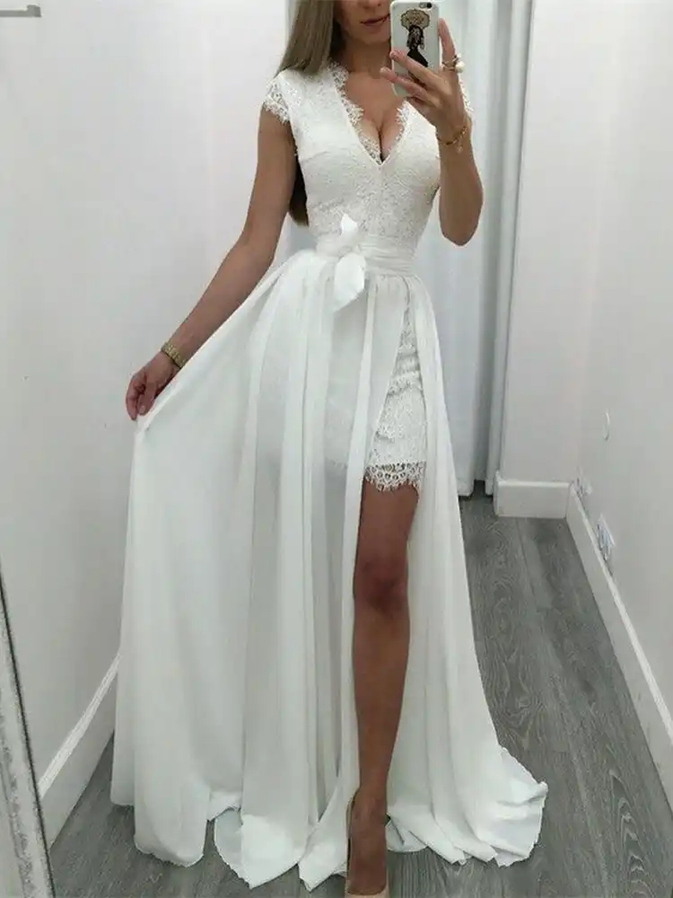 White Off Shoulder Lace Up Slit Spaghetti Strap Bodycon Wedding