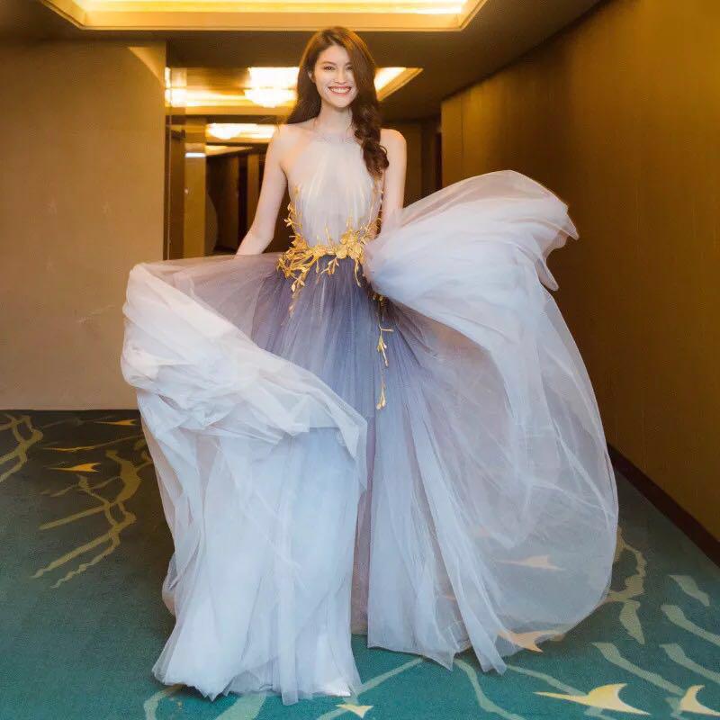 Ombre Tulle White Grey Halterneck Long Gown Evening Dress