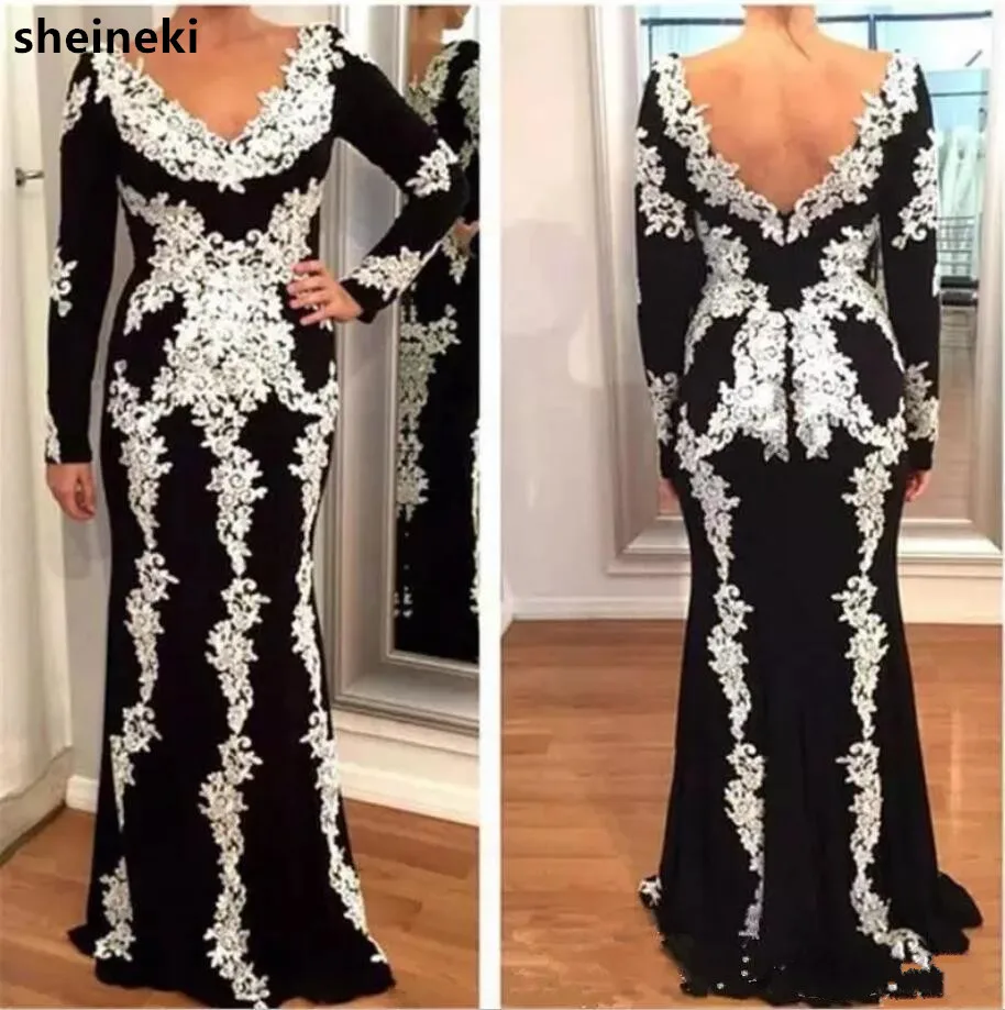 Black V Neck Mother Of The Bride Dresses With White Appliques Long