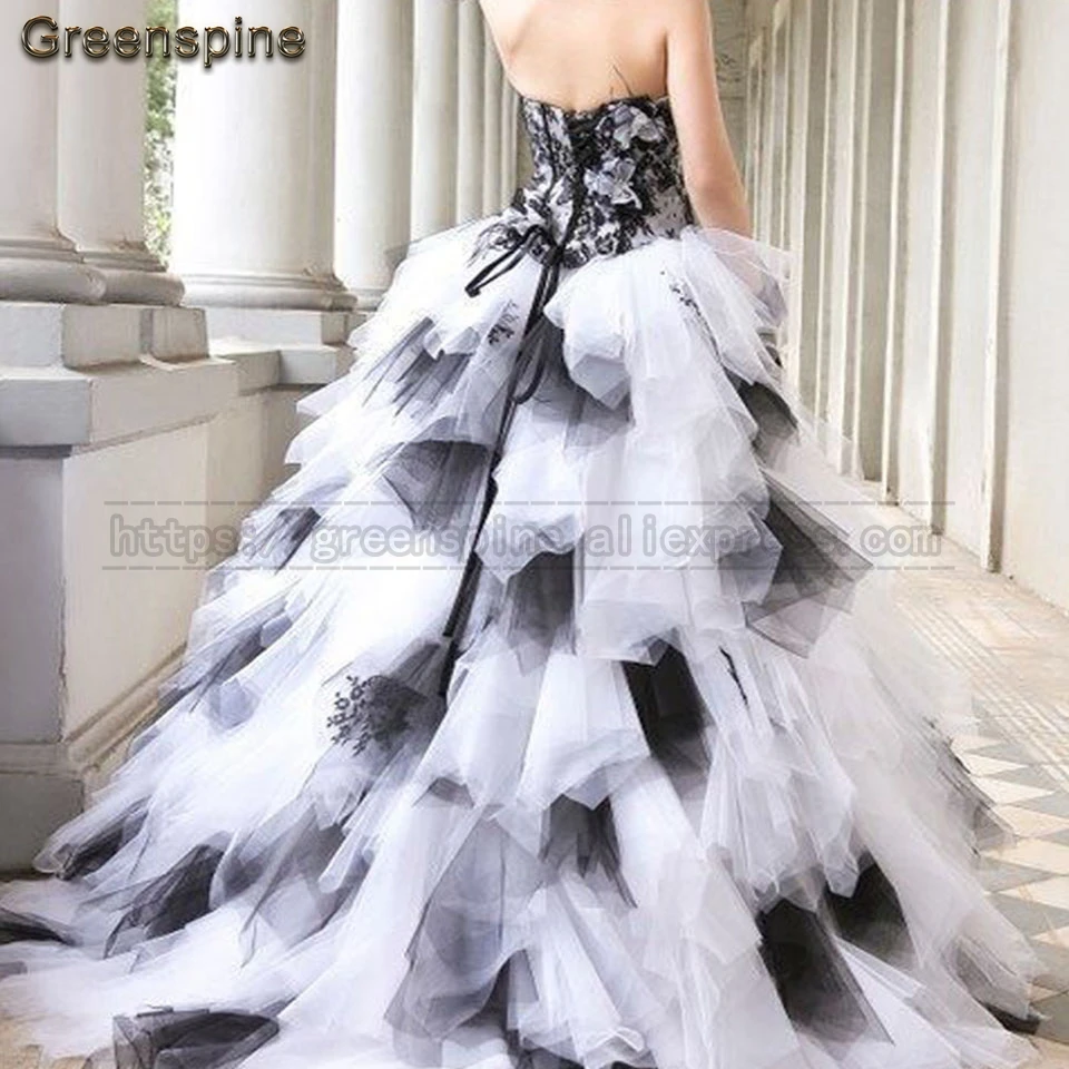 Discount 2019 Black And White Wedding Dresses Gothic Lace Applique