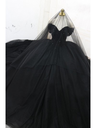 Black Gothic Beading Off The Shoulder Ball Gown Wedding Dress