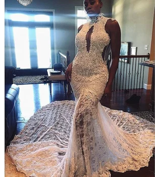 Africa Ghana Sexy Halter Neck Long Tail Wedding Dress Mermaid Gown