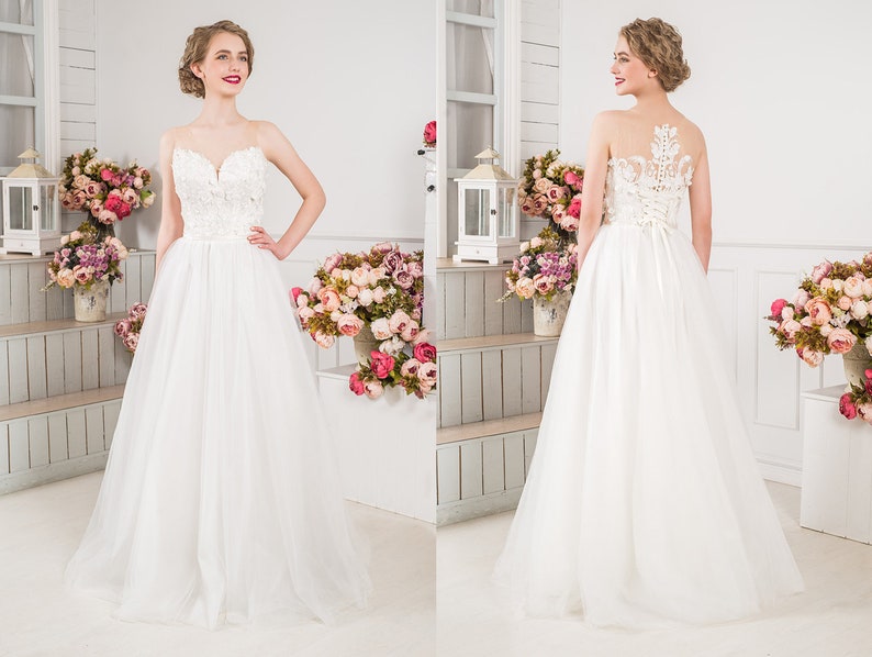 Illusion Neckline Beaded Lace Top Boho Wedding Dress Ball Gown Etsy