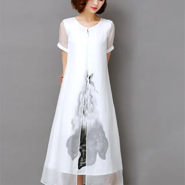 2019 Spring Summer White Print Women Long Dress Short Sleeve Linen