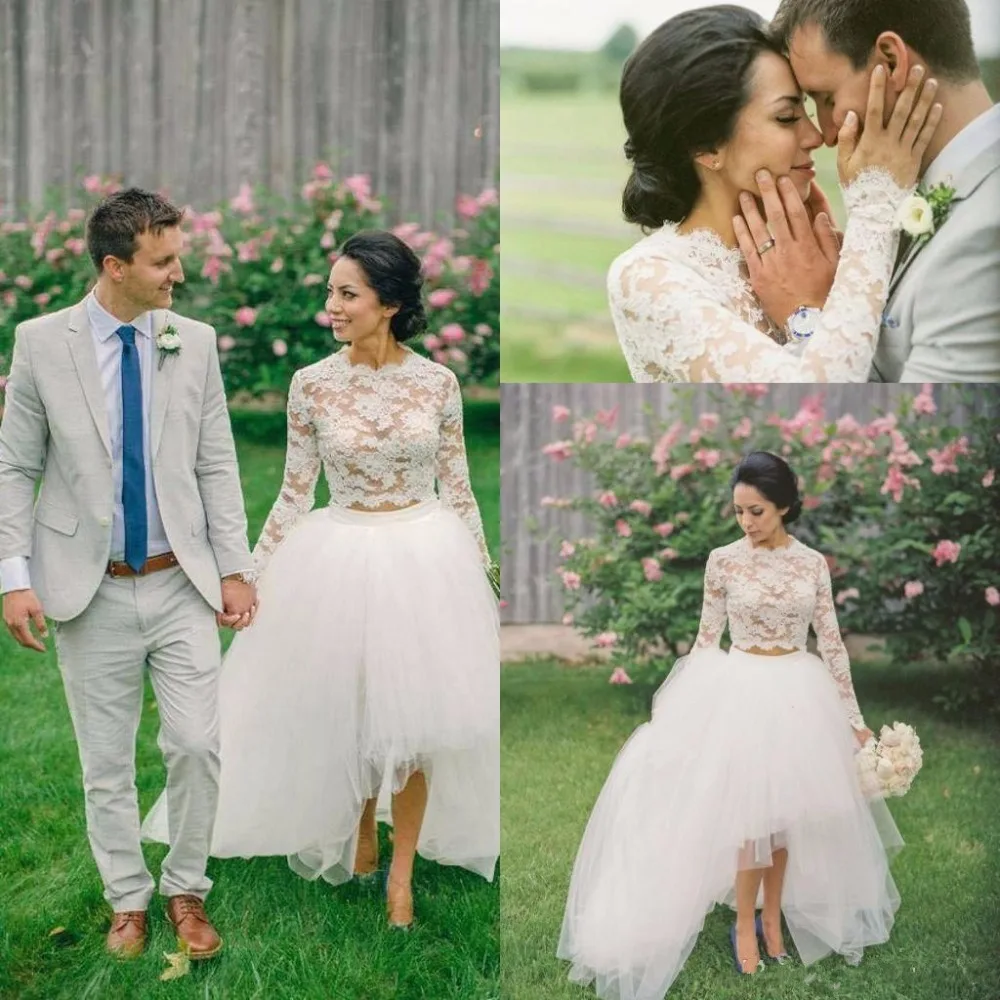 2017 Country High Low 2 Piece Wedding Dresses Long Sleeves White
