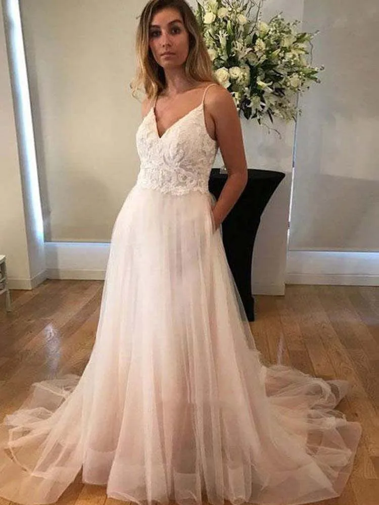 White Spaghetti Strap V Neck Open Back Lace Wedding Dresses Prom