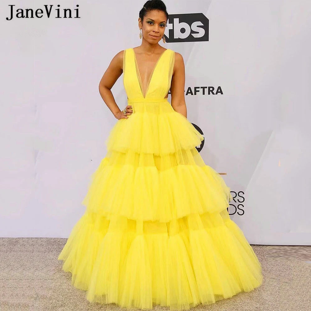 Janevini Sexy Deep V Neck Yellow Prom Dresses Plus Size A Line